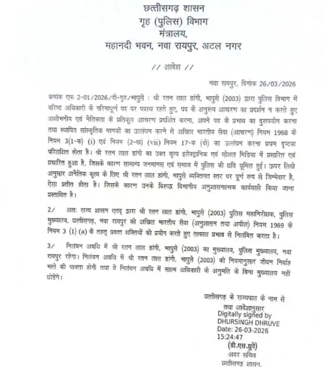 रायपुर: छत्तीसगढ़ सरकार ने पुलिस महकमे में एक बड़ी कार्रवाई करते हुए वरिष्ठ आईपीएस (IPS) अधिकारी और पूर्व आईजी रतन लाल डांगी को तत्काल प्रभाव से निलंबित कर दिया है। गृह (पुलिस) विभाग द्वारा जारी आधिकारिक आदेश के अनुसार, यह सख्त कदम एक सब-इंस्पेक्टर (SI) की पत्नी द्वारा लगाए गए यौन उत्पीड़न के आरोपों के बाद उठाया गया है।