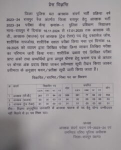रायपुर रेंज के अंतर्गत जिला पुलिस बल आरक्षक संवर्ग भर्ती प्रक्रिया वर्ष 2023-24 के परिणाम घोषित कर दिए गए हैं।...