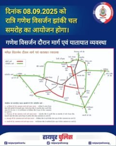 रात्रि गणेश विसर्जन झांकी के दौरान रायपुर में यातायात व्यवस्था और मार्ग परिवर्तन की जानकारी नीचे दी गई है: रायपुर,...