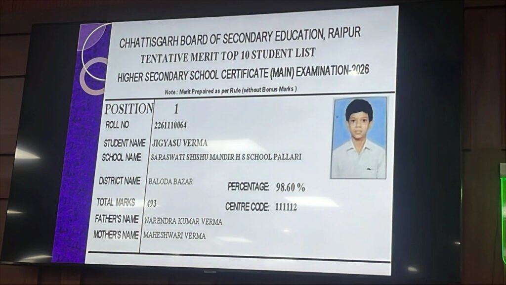 CG BREAKING : रायपुर 29 अप्रैल 2026। बोर्ड परीक्षा का परिणाम जारी कर दिया गया है। इस दौरान 10वीं और 12वीं की परीक्षा में मेरिट लिस्ट में आये परीक्षार्थियों के नाम भी जारी किये गये हैं। देखिये…