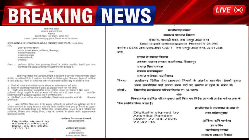 आदेश में Chhattisgarh Civil Services Conduct Rules का हवाला देते हुए यह भी कहा गया था कि कोई भी कर्मचारी बिना सक्षम प्राधिकारी की पूर्व अनुमति के किसी शासकीय या अशासकीय संस्था, समिति या संगठन में कोई पद धारण नहीं करेगा। साथ ही ऐसे दायित्व स्वीकार करने पर भी रोक लगाई गई थी, जिससे उसकी प्रशासनिक निष्पक्षता प्रभावित हो सकती हो। नियमों के उल्लंघन पर कड़ी अनुशासनात्मक कार्रवाई की चेतावनी भी दी गई थी।