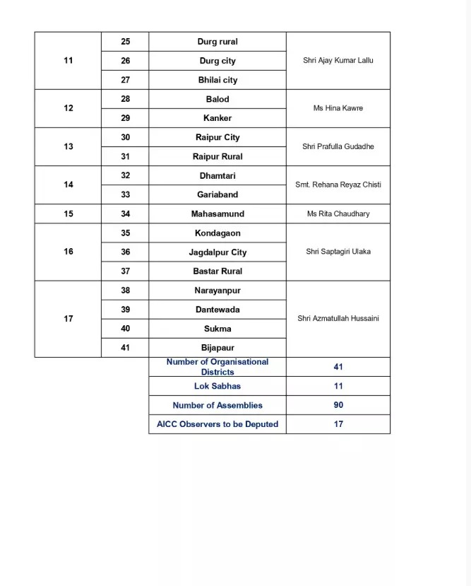 रायपुर। छत्तीसगढ़ कांग्रेस में संगठन को ज़मीनी स्तर पर मज़बूत करने की कवायद तेज़ हो गई है। प्रदेश कांग्रेस कमेटी ने जिला अध्यक्षों के चुनाव के लिए रायशुमारी शुरू कर दी है, जिसके लिए विभिन्न जिलों में पर्यवेक्षकों (Observers) की नियुक्ति की गई है।