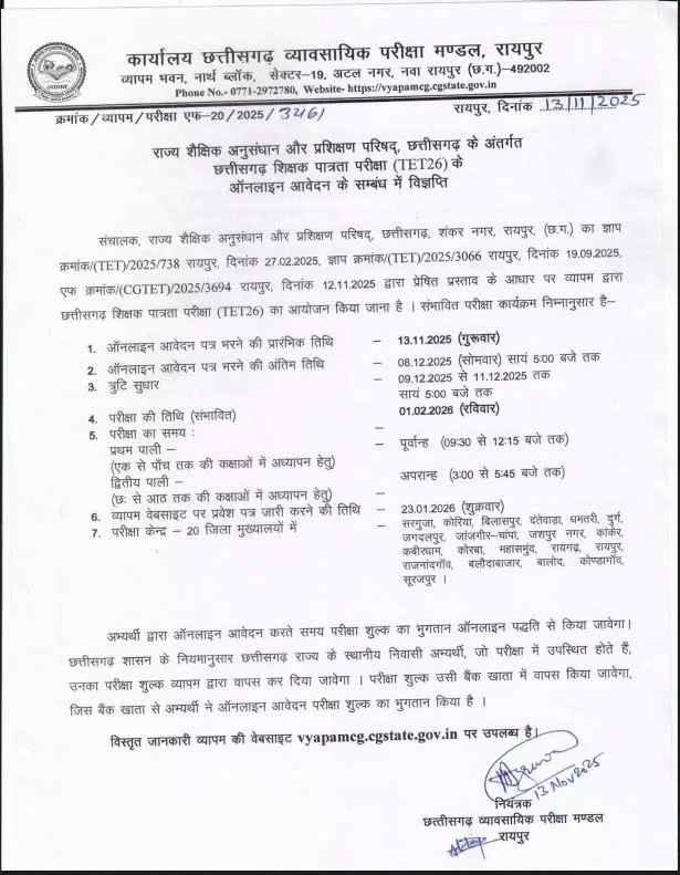 CGPEB के मुताबिक, CG TET 2025-26 परीक्षा 1 फरवरी 2026 को आयोजित की जाएगी। यह परीक्षा राज्य के सरकारी स्कूलों में शिक्षक बनने के इच्छुक उम्मीदवारों की पात्रता निर्धारित करने के लिए आयोजित की जाती है।