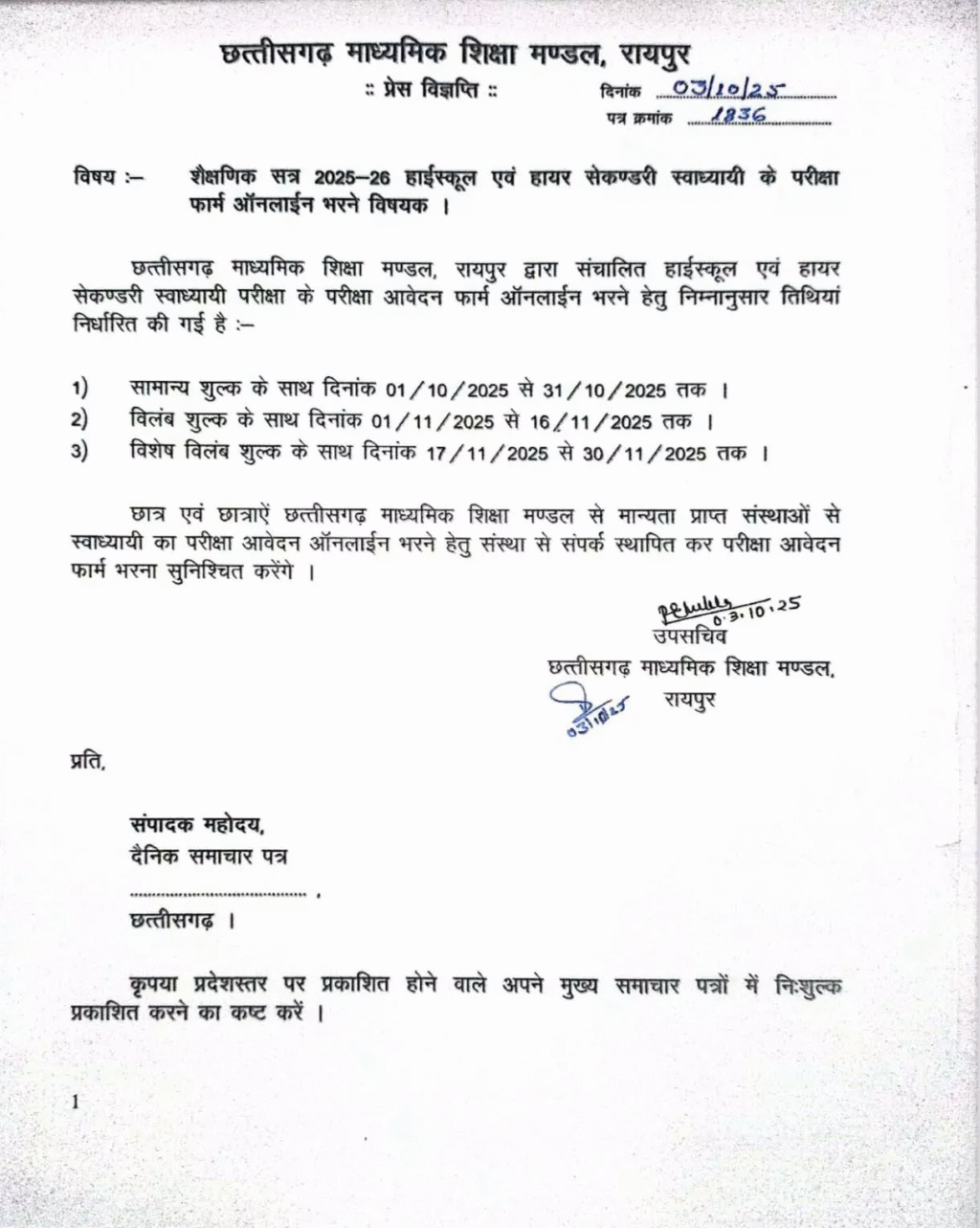 CGBSE 10th 12th Form रायपुर | 3 अक्टूबर 2025| छत्तीसगढ़ माध्यमिक शिक्षा मंडल (CGBSE), रायपुर ने शैक्षणिक सत्र 2025-26 के लिए हाईस्कूल (कक्षा 10वीं) और हायर सेकेंडरी (कक्षा 12वीं) बोर्ड परीक्षा के लिए स्वाध्यायी विद्यार्थियों से ऑनलाइन आवेदन आमंत्रित किए हैं। मंडल ने स्पष्ट निर्देश जारी किए हैं कि आवेदन केवल मान्यता प्राप्त शैक्षणिक संस्थानों के माध्यम से ही किए जा सकेंगे।