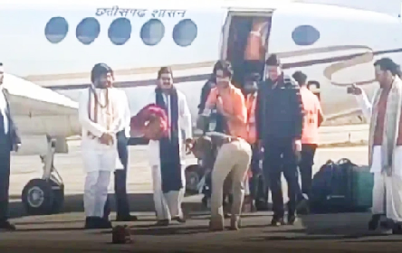 सरकारी विमान से रायपुर पहुंचे धीरेंद्र शास्त्री, मंत्री खुशवंत संग जूते-टोपी उतारकर किए पैर छूने के दृश्य पर कांग्रेस ने साधा निशाना