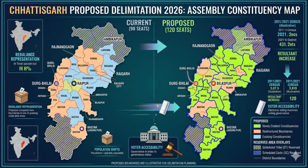 Delimitation 2026 : रायपुर | 4 अप्रैल, 2026 भारत में वर्ष 2026 के बाद प्रस्तावित देशव्यापी परिसीमन (Delimitation) को लेकर छत्तीसगढ़ के गलियारों में अभी से सियासी हलचल तेज हो गई है। जनसंख्या के नए आंकड़ों और भौगोलिक विस्तार के आधार पर होने वाले इस बदलाव से राज्य का राजनीतिक नक्शा पूरी तरह बदल सकता है। विशेषज्ञों और रणनीतिकारों का मानना है कि इस प्रक्रिया के बाद न केवल विधानसभा सीटों की संख्या बढ़ेगी, बल्कि कई मौजूदा आरक्षित और सामान्य सीटों का स्वरूप भी बदल जाएगा।
