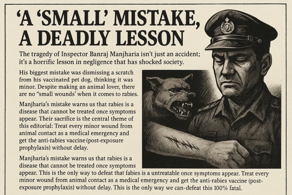 मंझरिया जी की यह चूक हमें चेतावनी देती है कि रेबीज एक ऐसी बीमारी है जिसके लक्षण दिखने के बाद इलाज संभव नहीं है। उनका बलिदान इस संपादकीय का केंद्रीय विषय है: पशु संपर्क से होने वाले हर छोटे घाव को मेडिकल इमरजेंसी की तरह लें और बिना देरी किए एंटी-रेबीज वैक्सीन (Post-Exposure Prophylaxis) लगवाएँ। यही एकमात्र रास्ता है जिससे हम इस 100% घातक, लेकिन 100% रोकथाम योग्य बीमारी को हरा सकते हैं। - रेबीज: घातक है, पर रोकी जा सकती है इंस्पेक्टर मंझरिया का दुर्भाग्यपूर्ण निधन हमें रेबीज नामक बीमारी की भयानक गंभीरता की याद दिलाता है। यह वह सच्चाई है जिसे हमारा समाज अक्सर नज़रअंदाज़ कर देता है: रेबीज 100% घातक (Fatal) है। इसका अर्थ स्पष्ट है—एक बार इस बीमारी के लक्षण (जैसे पानी से डर या हाइड्रोफोबिया, बेचैनी) दिखने शुरू हो जाएं, तो फिर दुनिया की कोई भी चिकित्सा प्रणाली या दवा व्यक्ति को बचा नहीं सकती। परिणाम केवल और केवल मृत्यु होता है।