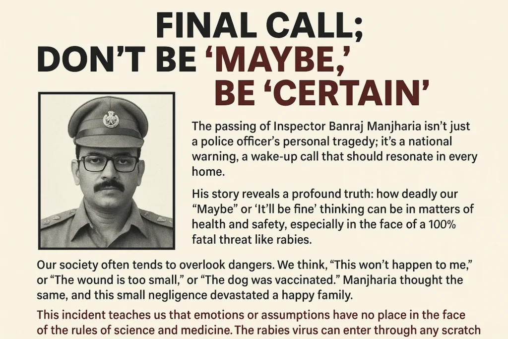 - अंतिम आह्वान: ‘शायद’ नहीं, ‘निश्चित’ बनें! – इंस्पेक्टर बानराज मंझरिया का निधन केवल एक पुलिस अधिकारी की निजी त्रासदी नहीं है; यह एक राष्ट्रीय चेतावनी है, एक ऐसा वेक-अप कॉल है जिसकी गूँज हर घर तक पहुँचनी चाहिए। उनकी कहानी एक गहरा सत्य उजागर करती है: स्वास्थ्य और सुरक्षा के मामलों में, खासकर रेबीज जैसे 100% घातक खतरे के सामने, हमारी ‘शायद’ (Maybe) या ‘सब ठीक होगा’ (It’ll be fine) वाली सोच कितनी जानलेवा हो सकती है।