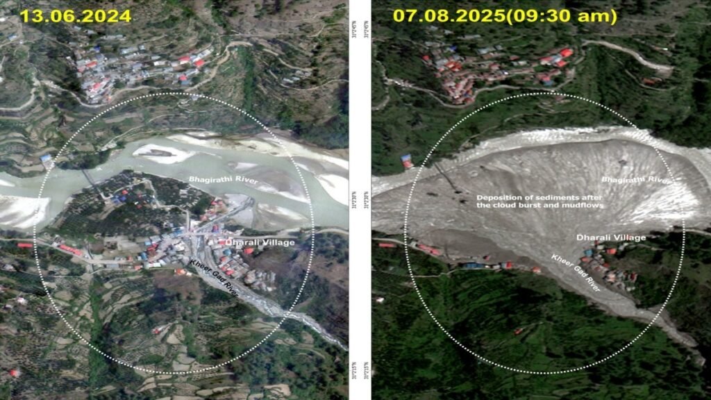 इसरो/एनआरएससी ने दो तस्वीरें जारी की हैं। पहली सैटेलाइट तस्वीर 16 जून 2024 की है, दूसरी सैटेलाइट तस्वीर हादसे के बाद 7 अगस्त 2025 की है। उत्तराखंड के धराली और हरसिल में 5 अगस्त को आई विनाशकारी बाढ़ का आकलन करने के लिए कार्टोसैट-2एस डेटा का उपयोग किया है। हाई रिज़ॉल्यूशन वाली तस्वीरों में डूबी हुई इमारतें, फैला हुआ मलबा (लगभग 20 हेक्टेयर) और नदी के रास्ते बदले हुए दिखाई दे रहे हैं, जो जमीन पर बचाव दलों के लिए महत्वपूर्ण हैं।