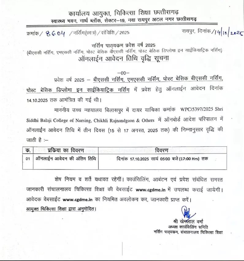 Nursing Admission 2025 रायपुर। राज्य के नर्सिंग महाविद्यालयों में प्रवेश के लिए ऑनलाइन आवेदन भरने की अंतिम तिथि तीन दिन बढ़ा दी गई है। अब विद्यार्थी 17 अक्टूबर, शाम 5 बजे तक नर्सिंग पाठ्यक्रमों में प्रवेश के लिए आवेदन कर सकते हैं।