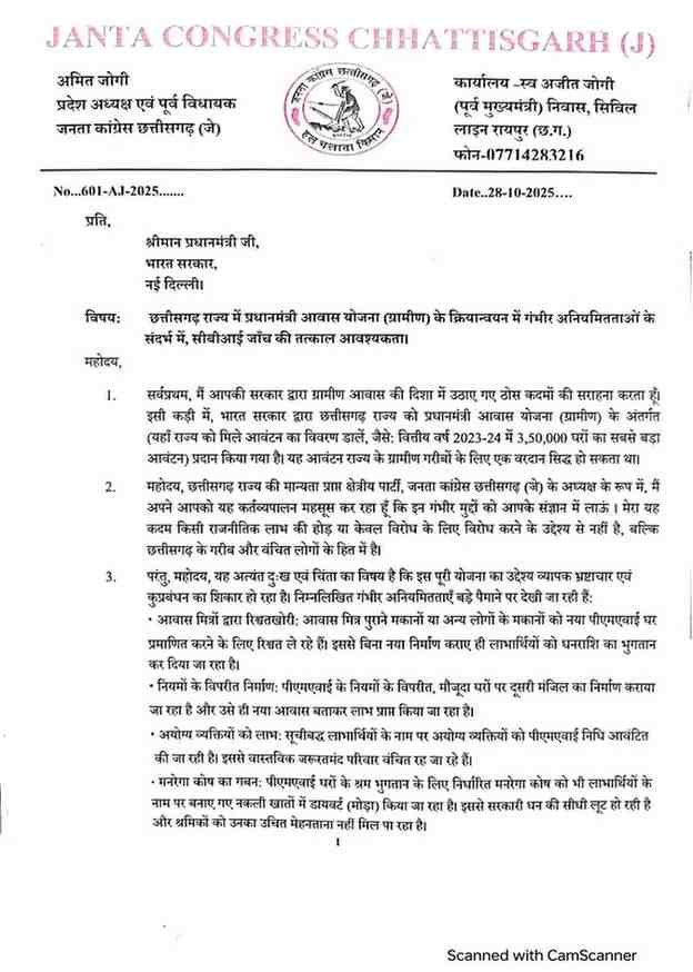 जोगी ने अपने पत्र में यह भी उल्लेख किया कि योजना के तहत आवंटित धन का बड़ा हिस्सा फर्जी लाभार्थियों और ठेकेदारों तक पहुंचा, जबकि वास्तविक गरीब अब भी घर का इंतजार कर रहे हैं। उन्होंने कहा, “यह सिर्फ आर्थिक नहीं, बल्कि मानवता के खिलाफ अपराध है।”