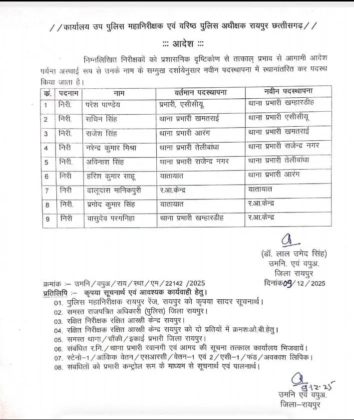 रायपुर, छत्तीसगढ़—वरिष्ठ पुलिस अधीक्षक, रायपुर के कार्यालय से एक महत्वपूर्ण प्रशासनिक कदम उठाते हुए, नौ निरीक्षक-स्तर के अधिकारियों के तत्काल प्रभाव से तबादले के आदेश जारी किए गए हैं। इन अधिकारियों में पांच थानों के प्रभारी (SHO) शामिल हैं। यह आदेश कानून व्यवस्था को मजबूत करने और पुलिस बल के भीतर प्रशासनिक दक्षता बनाए रखने के उद्देश्य से 9 दिसंबर 2025 को जारी किया गया।