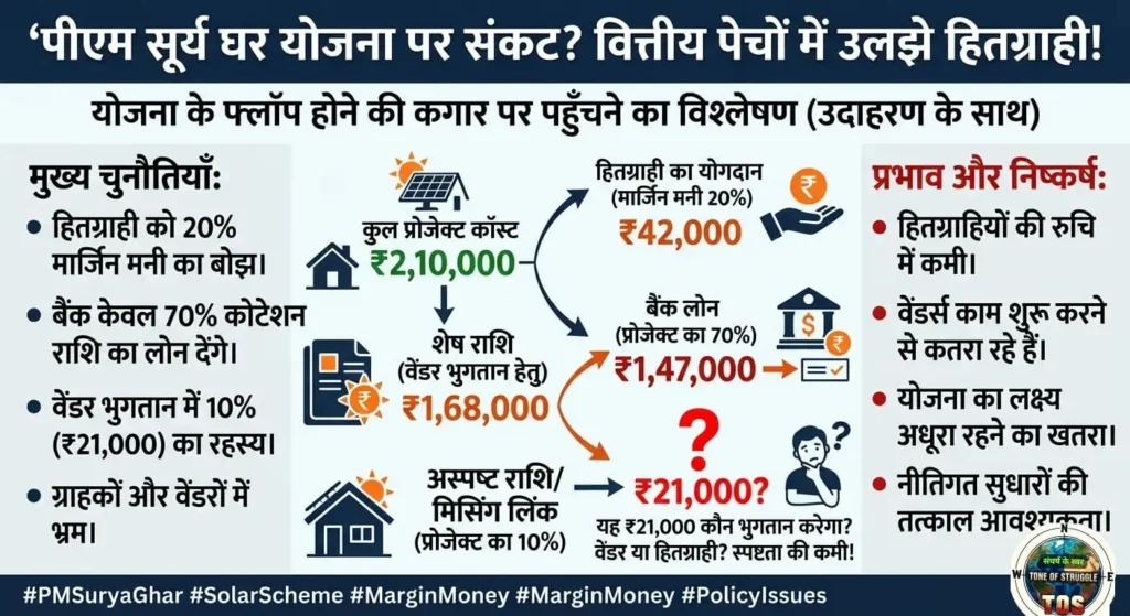 इस योजना के तहत सोलर पैनल लगवाने वाले हितग्राहियों के सामने सबसे बड़ी चुनौती इसके वित्तीय ढांचे की है। नई शर्तों के अनुसार, हितग्राही को अब कुल प्रोजेक्ट कॉस्ट (परियोजना लागत) का 20 प्रतिशत हिस्सा ‘मार्जिन मनी’ के रूप में अपनी जेब से लगाना पड़ रहा है। आम और मध्यम वर्गीय परिवारों के लिए एकमुश्त इतनी बड़ी राशि जुटाना योजना के ‘मुफ्त या सस्ती बिजली’ वाले मूल उद्देश्य पर ही सवालिया निशान लगा रहा है। शुरुआती खर्च को देखकर कई हितग्राही अब अपने कदम पीछे खींच रहे हैं।